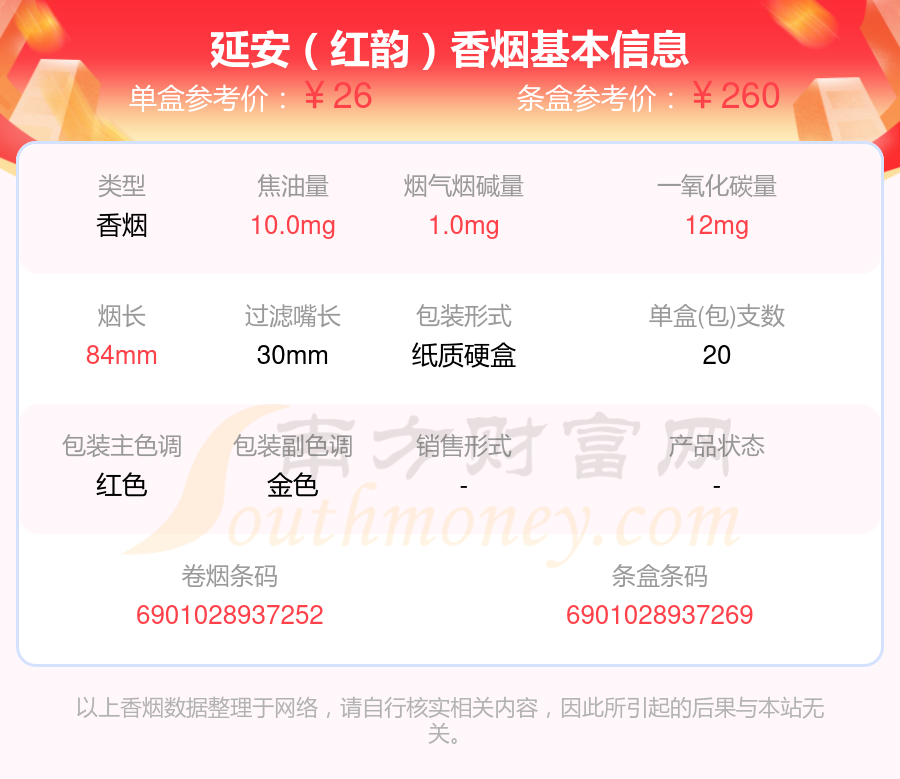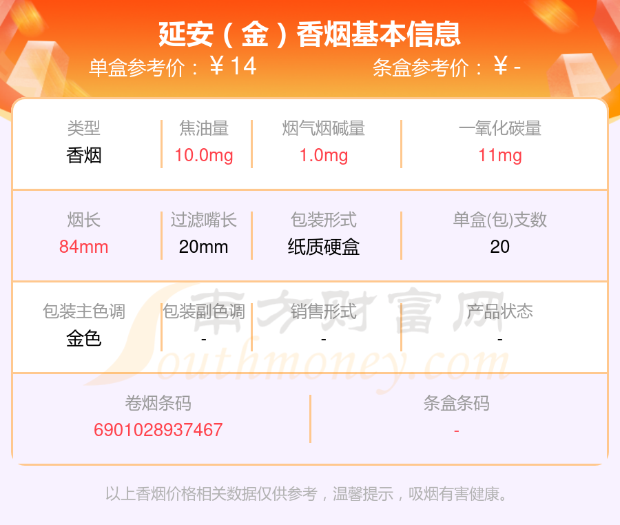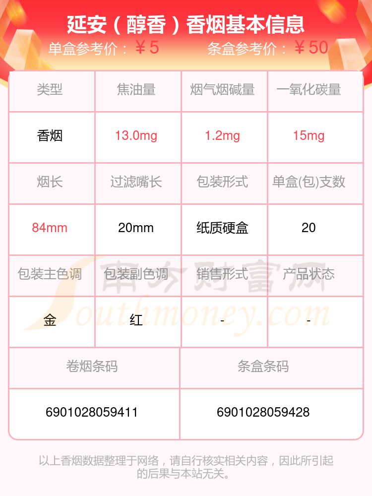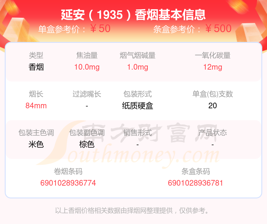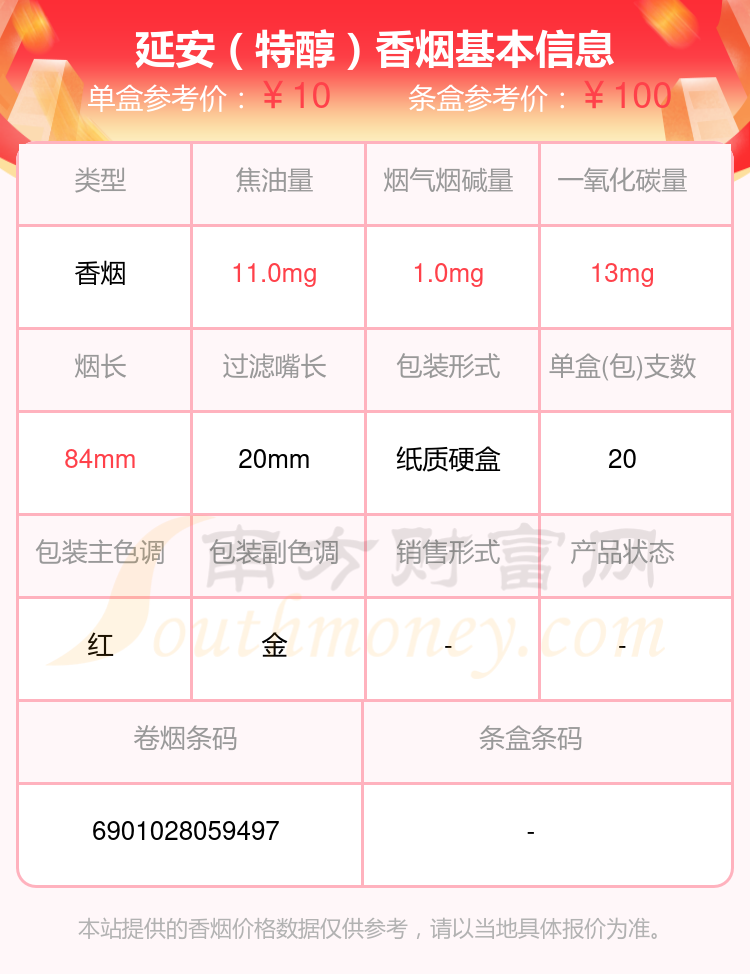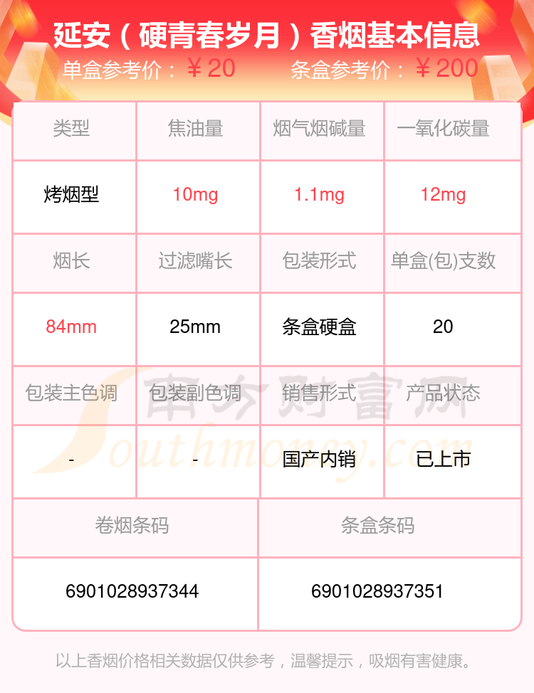 延安(醇香)參考價5.0元/包、延安(精品)參考價13.0元/包、延安(硬青春歲月)參考價20元/包、延安(千年帝都)參考價80.0元/包、延安(特醇)參考價10.0元/包、延安(1935)參考價50.0元/包、延安(金)參考價14.0元/包、延安(紅韻)參考價26.0元/包、延安(五星)參考價13.0元/包、延安(世紀經(jīng)典)參考價23.0元/包等。