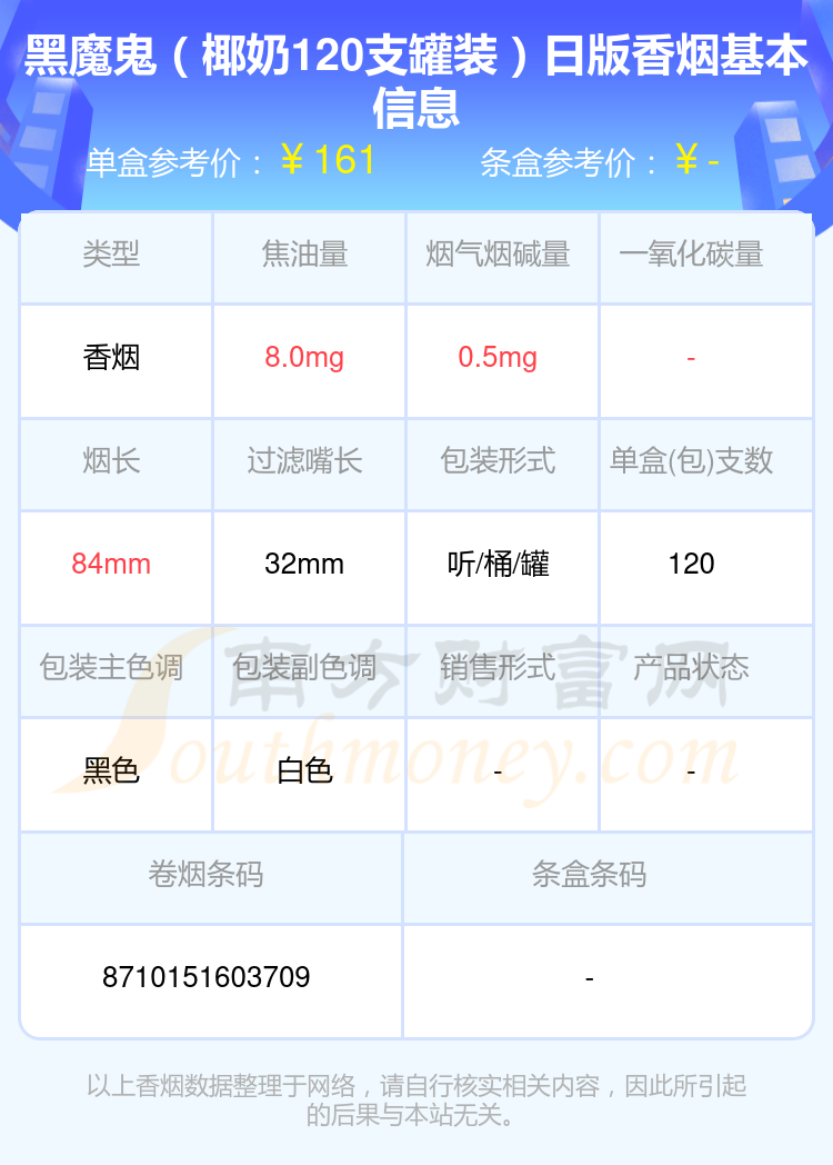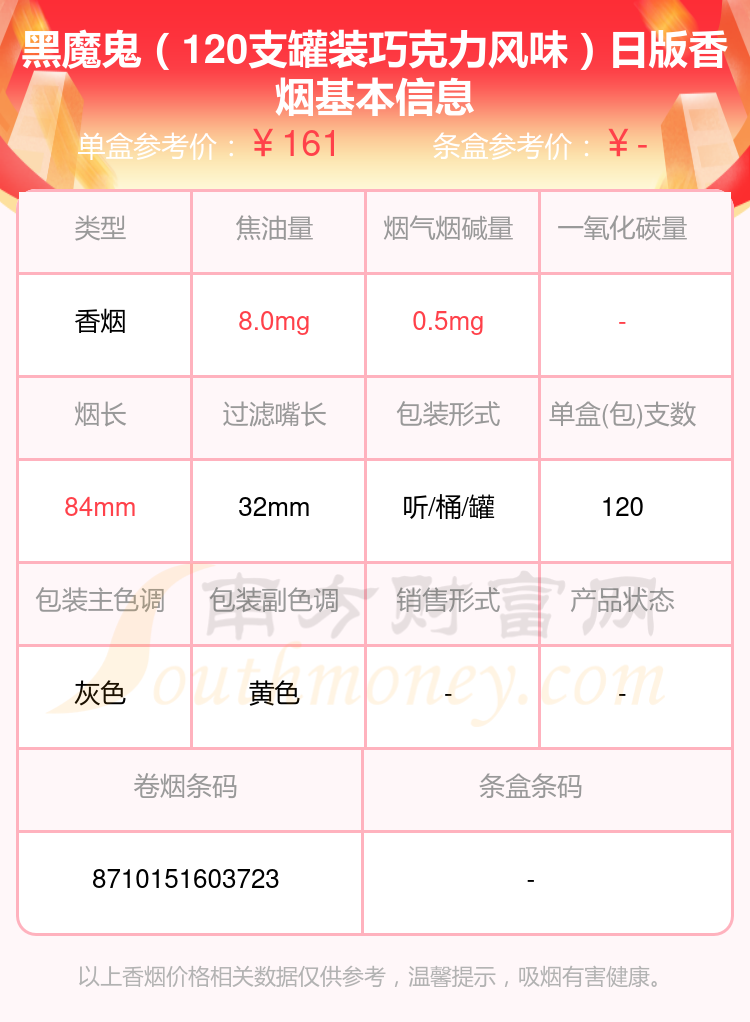 煙堿量低于0.5mg的BLACK DEVIL(黑魔鬼)香煙有哪些?擇煙網為大家整理盤點,有黑魔鬼(椰奶120支罐裝)日版、黑魔鬼(120支罐裝巧克力風味)日版等,詳細價格如下: