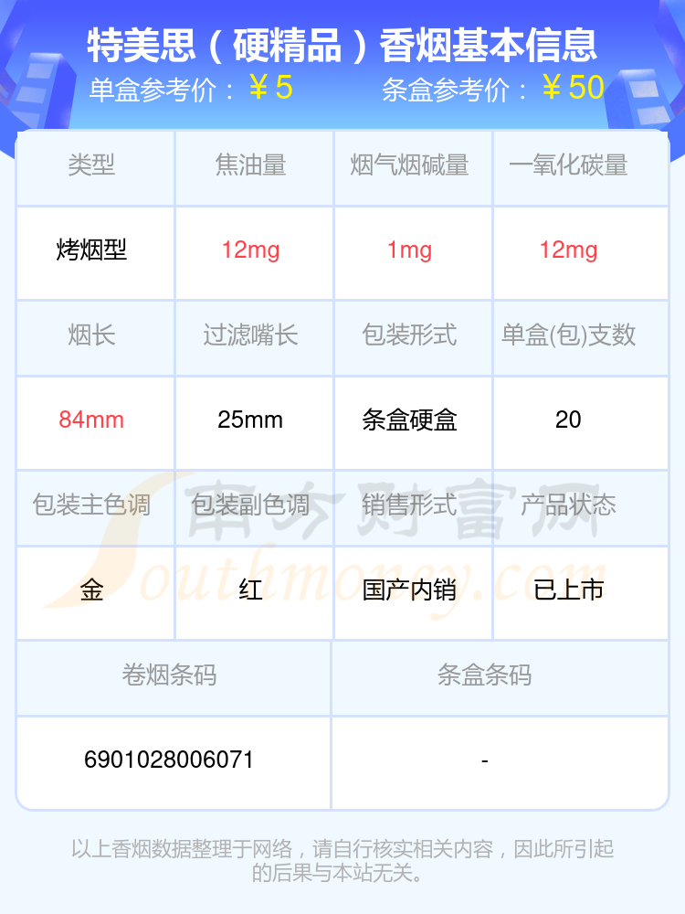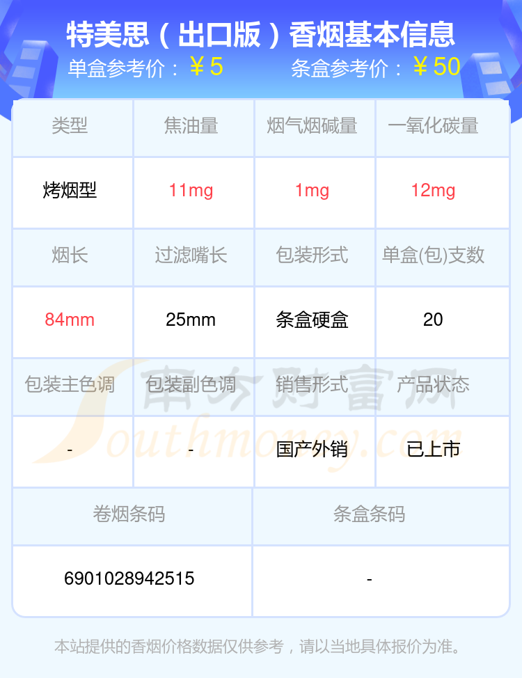 擇煙網(wǎng)為大家盤點(diǎn)了尼古丁量1mg以下的特美思香煙,分別有特美思(出口版)、特美思(硬精品)、特美思(軟)、特美思(硬)等,具體價(jià)格如下: