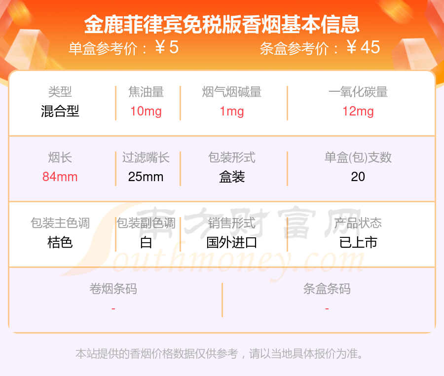 GOLDEN HIND金鹿香煙尼古丁量1mg以下的煙分別有金鹿13mg出口版參考價(jià)5元/包、金鹿菲律賓免稅版參考價(jià)5元/包、金鹿(硬12mg出口)參考價(jià)3元/包、金鹿(硬白10mg出口臺(tái)灣版)參考價(jià)10元/包、金鹿(8mg)參考價(jià)2.5元/包、金鹿(硬黃8mg)出口臺(tái)灣版本參考價(jià)3元/包、金鹿(硬8mg出口)參考價(jià)2.5元/包、金鹿(硬黃8mg出口)參考價(jià)4元/包、金鹿(硬白5mg)出口臺(tái)灣版參考價(jià)3元/包等。