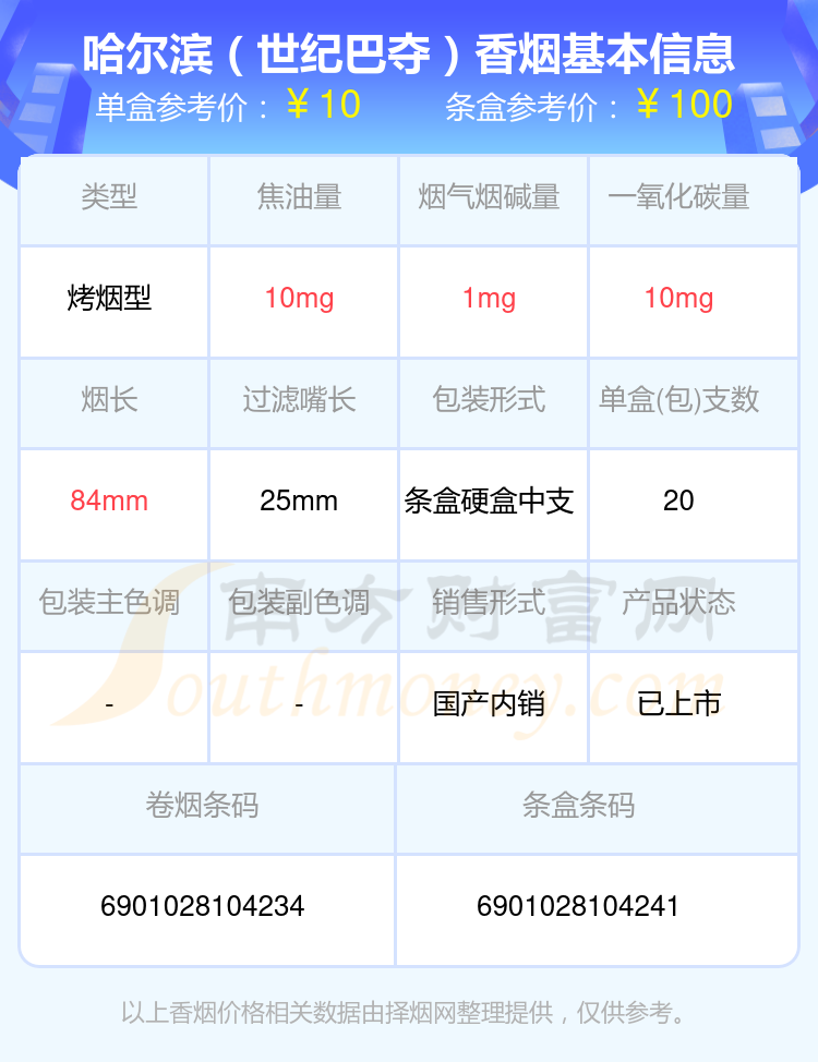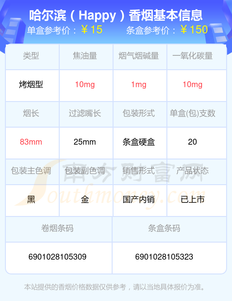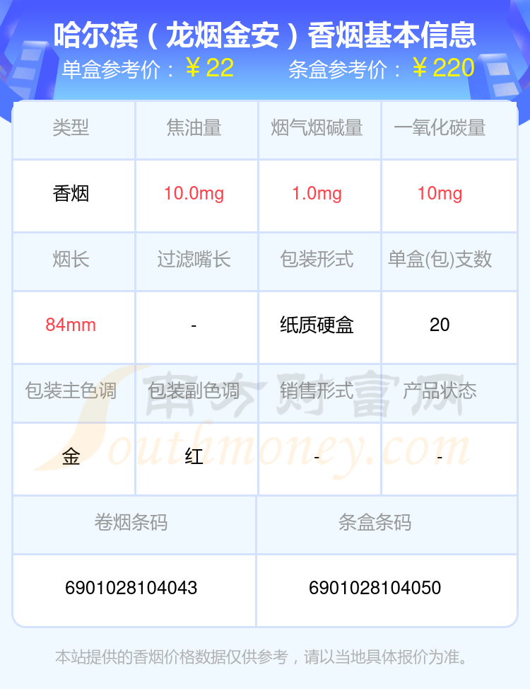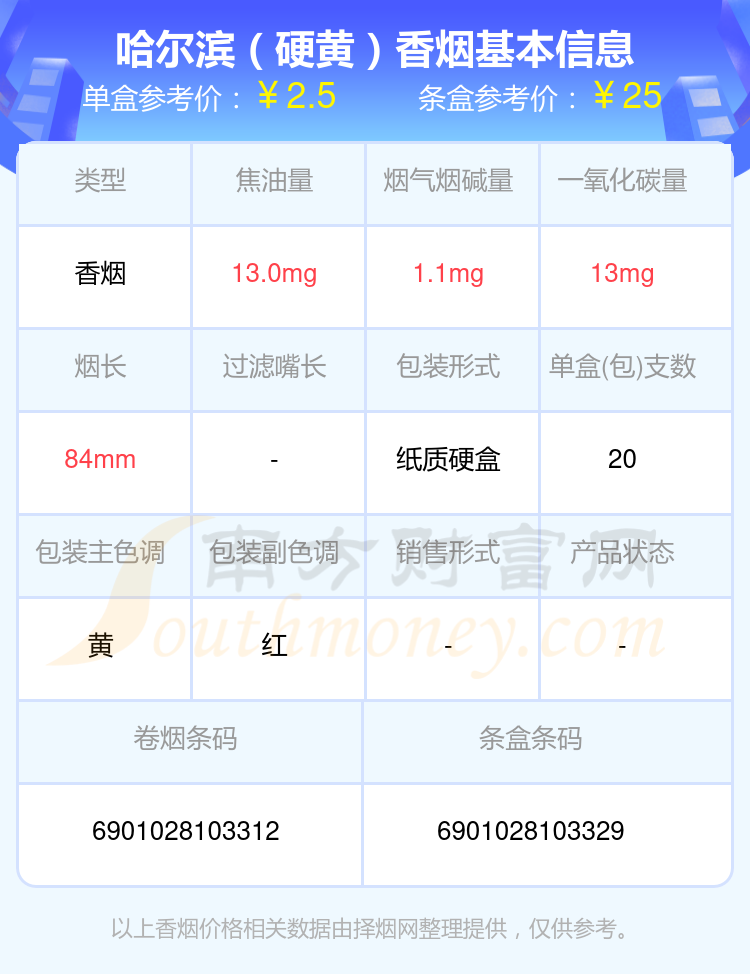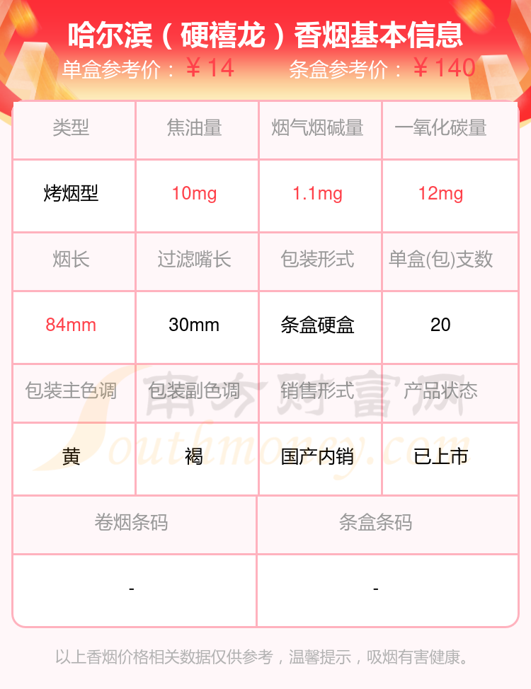 哈爾濱(硬禧龍)參考價14元/包、哈爾濱(禧龍)參考價14.0元/包、哈爾濱(硬黃)參考價2.5元/包、哈爾濱(龍煙祥和)參考價50.0元/包、哈爾濱(龍煙金安)參考價22.0元/包、哈爾濱(龍煙萬福)參考價32.0元/包、哈爾濱(世紀(jì)巴奪)參考價10元/包、哈爾濱(老巴奪)參考價10元/包、哈爾濱(Happy)參考價15元/包、哈爾濱(風(fēng)尚)參考價6元/包等。