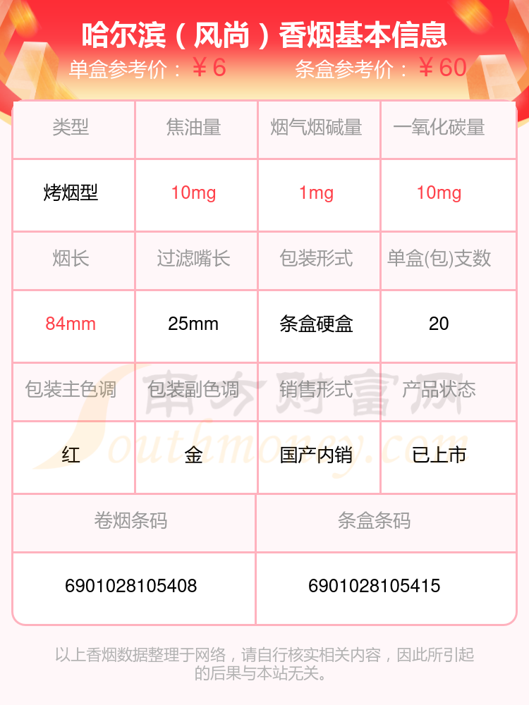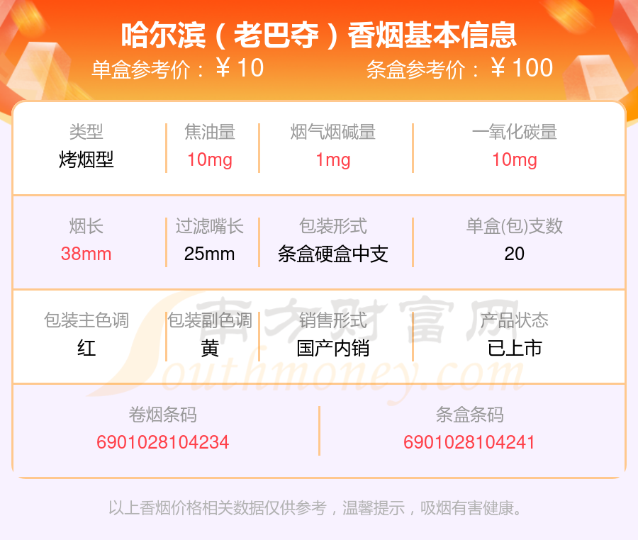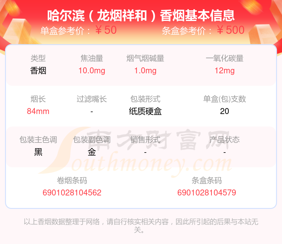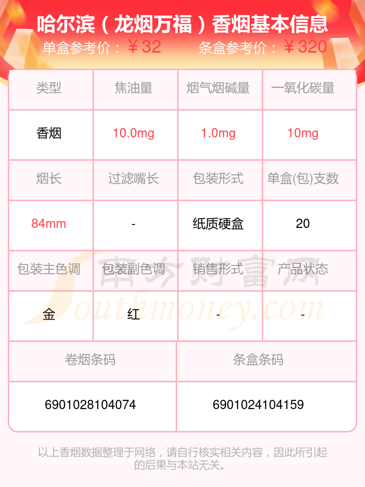 哈爾濱(硬禧龍)參考價14元/包、哈爾濱(禧龍)參考價14.0元/包、哈爾濱(硬黃)參考價2.5元/包、哈爾濱(龍煙祥和)參考價50.0元/包、哈爾濱(龍煙金安)參考價22.0元/包、哈爾濱(龍煙萬福)參考價32.0元/包、哈爾濱(世紀(jì)巴奪)參考價10元/包、哈爾濱(老巴奪)參考價10元/包、哈爾濱(Happy)參考價15元/包、哈爾濱(風(fēng)尚)參考價6元/包等。