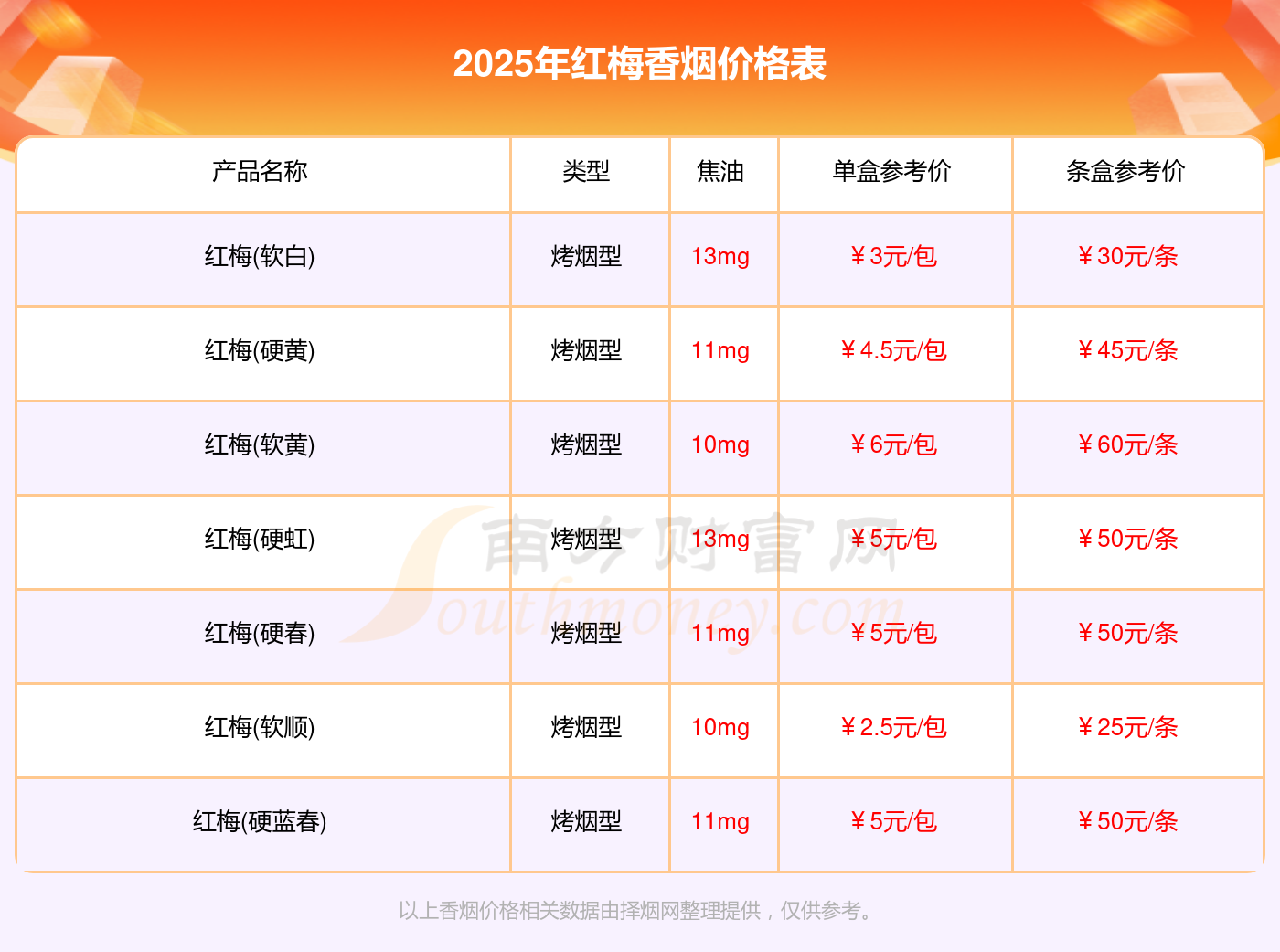 2025年紅梅香煙紅梅(軟黃)、紅梅(硬春)、紅梅(硬藍(lán)春)等最新價(jià)格如下: