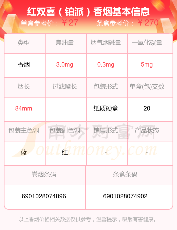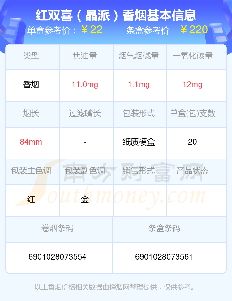 紅雙喜(滬)香煙20~50元的煙分別有紅雙喜(鉑派)參考價(jià)27.0元/包、紅雙喜(晶派)參考價(jià)22.0元/包等。