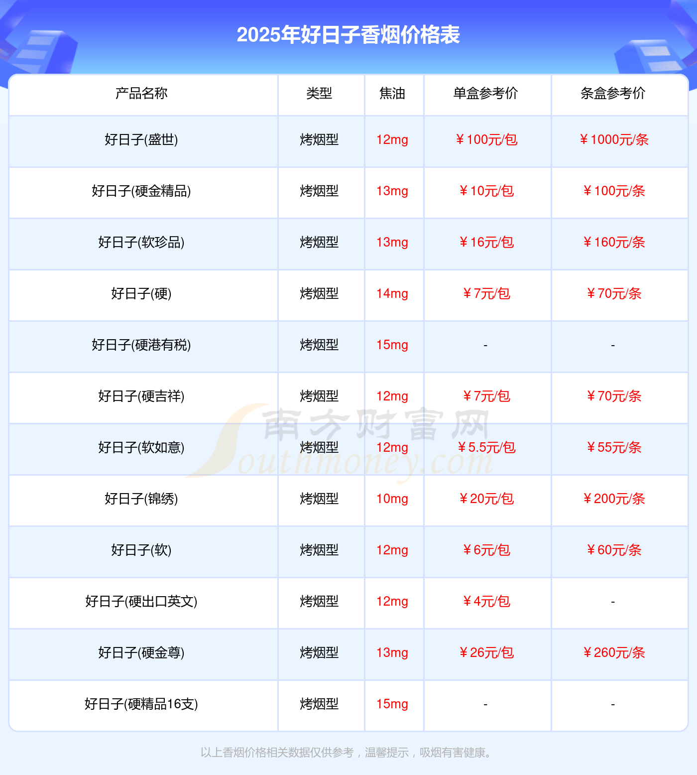 好日子(盛世)參考價100.0元/包、好日子(硬金尊)參考價26.0元/包、好日子(錦繡)參考價20.0元/包、好日子(軟珍品)參考價16.0元/包、好日子(硬金精品)參考價10.0元/包。