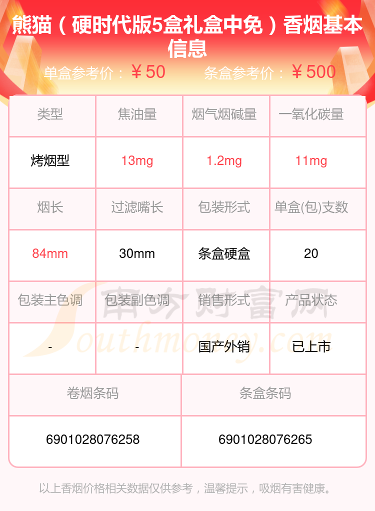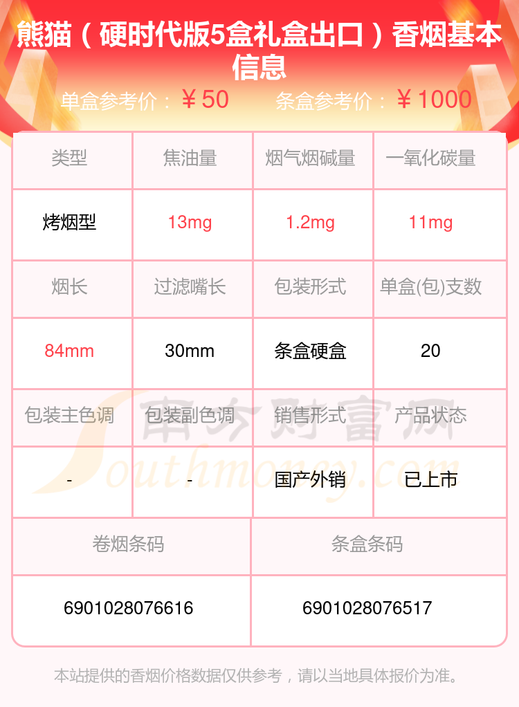 擇煙網(wǎng)為大家盤點了熊貓香煙三十至五十元的,分別有熊貓(硬5盒時代版出口)、熊貓(硬時代版5盒禮盒出口)、熊貓(硬時代版5盒禮盒中免)等,詳細價格如下: