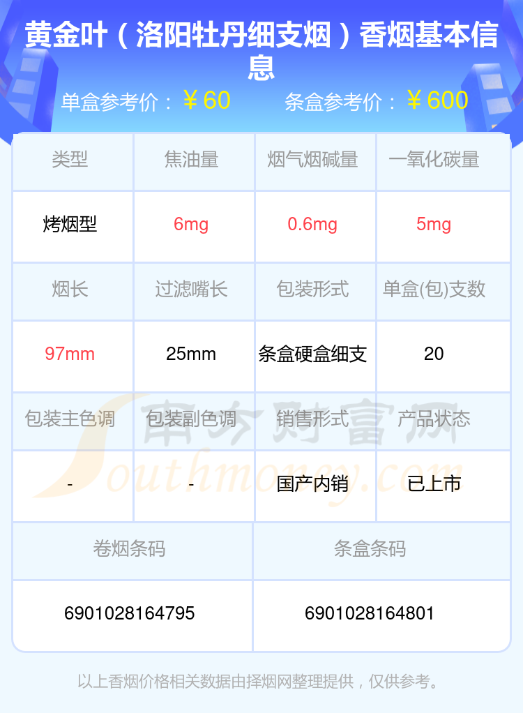 9、黃金葉(洛陽牡丹細(xì)支煙)