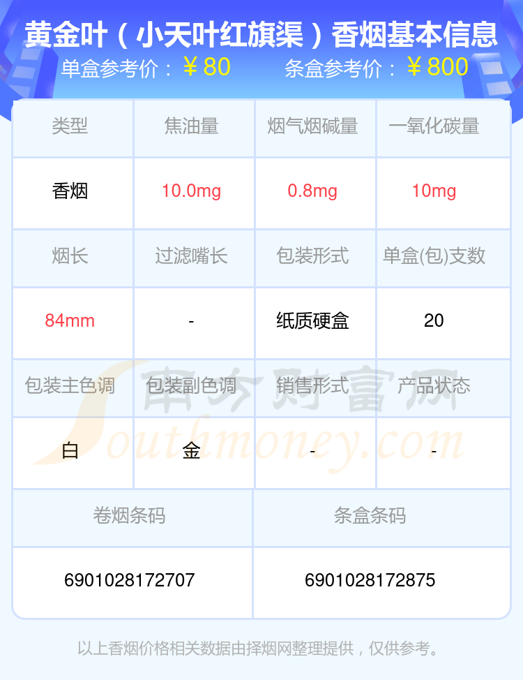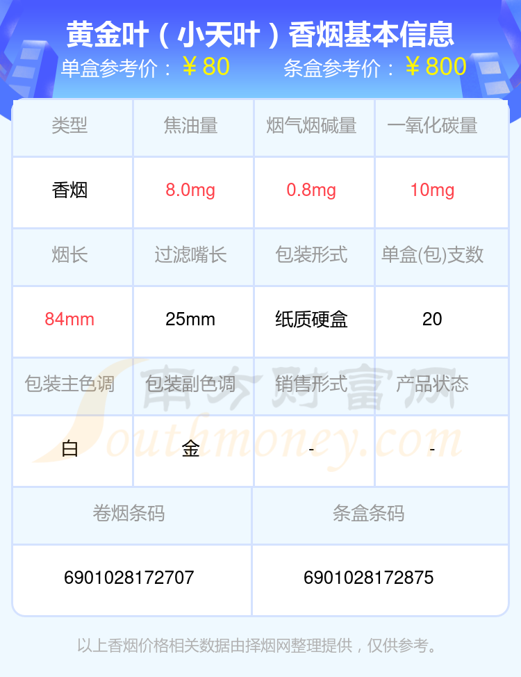 50元~100元的黃金葉香煙有哪些?擇煙網(wǎng)為大家整理盤點,分別有:黃金葉(小天葉)、黃金葉(小天葉紅旗渠)、黃金葉(軟黃金)、黃金葉(天尊)、黃金葉(上河圖)、黃金葉(云臺山)、黃金葉(三門峽)、黃金葉(洛陽天香)、黃金葉(洛陽牡丹細(xì)支煙)、黃金葉(天香細(xì)支)等,具體價格如下: