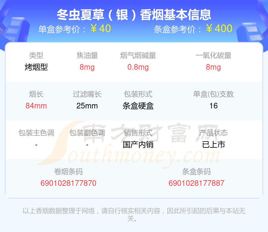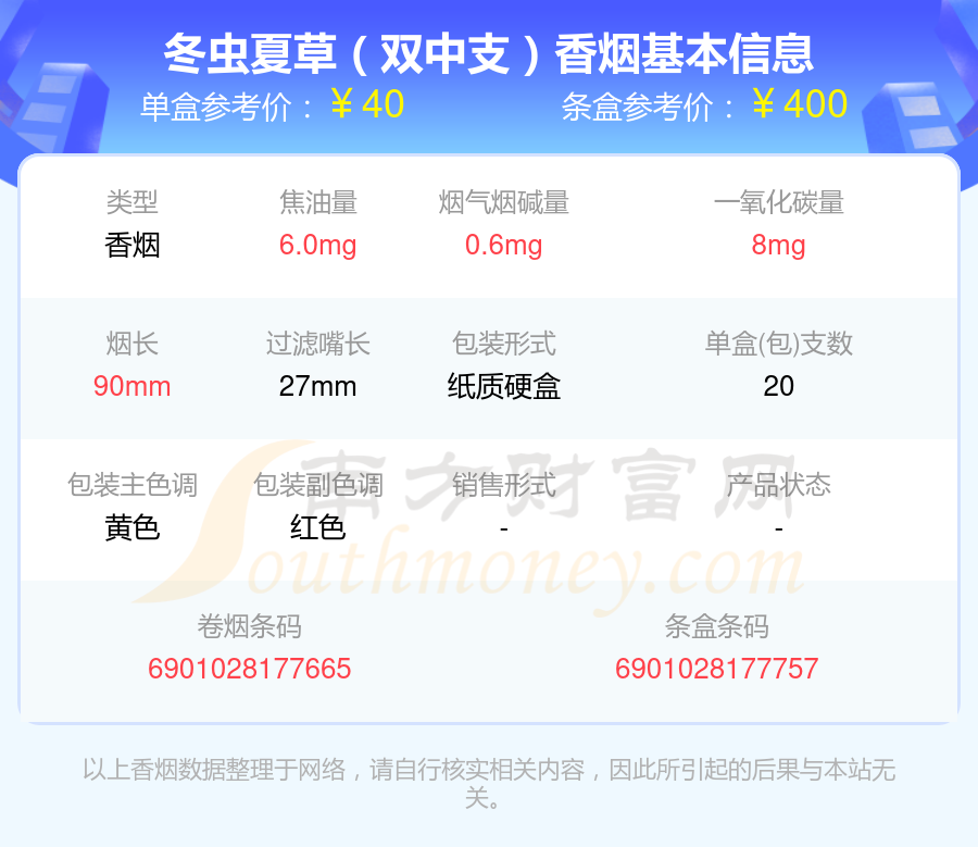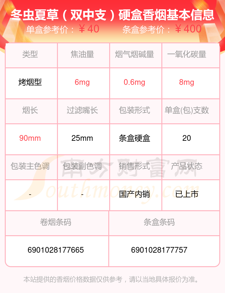 冬蟲夏草(雙中支)參考價40.0元/包、冬蟲夏草(銀)參考價40元/包、冬蟲夏草(銀)參考價40元/包、冬蟲夏草(雙中支)硬盒參考價40元/包等。