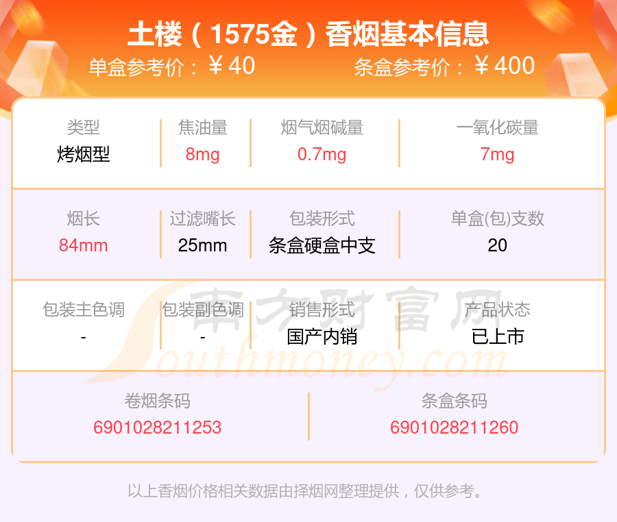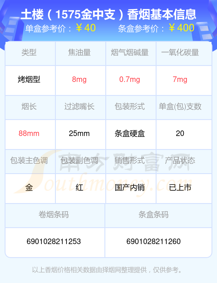 土樓香煙40至50元左右的煙有土樓(神韻)、土樓(1575金)、土樓(1575金中支)等,詳細(xì)價(jià)格如下:
