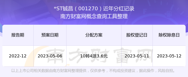 *ST鋮昌最新一次公布的分紅方案為10轉(zhuǎn)4派3.6元。本次權(quán)益分派股權(quán)登記日為2023年5月11日,除權(quán)除息日為2023年5月12日,派息日為2023年5月12日。