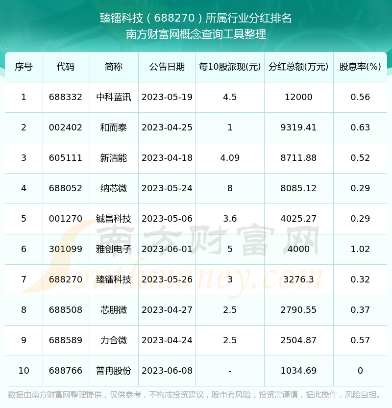 按照南方財(cái)富網(wǎng)趨勢(shì)選股系統(tǒng)統(tǒng)計(jì),臻鐳科技所屬行業(yè)為芯片行業(yè),芯片行業(yè)分紅排名情況如下表: