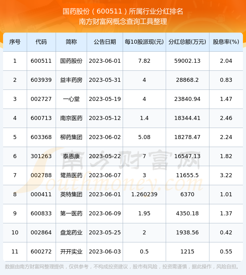 按照南方財富網(wǎng)趨勢選股系統(tǒng)統(tǒng)計,國藥股份所屬行業(yè)為醫(yī)藥商業(yè)行業(yè),醫(yī)藥商業(yè)行業(yè)分紅排名情況如下表: