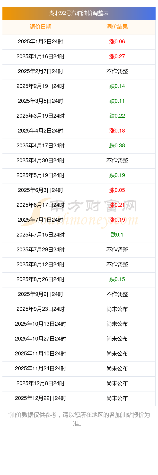 湖北92號(hào)汽油油價(jià)調(diào)整表