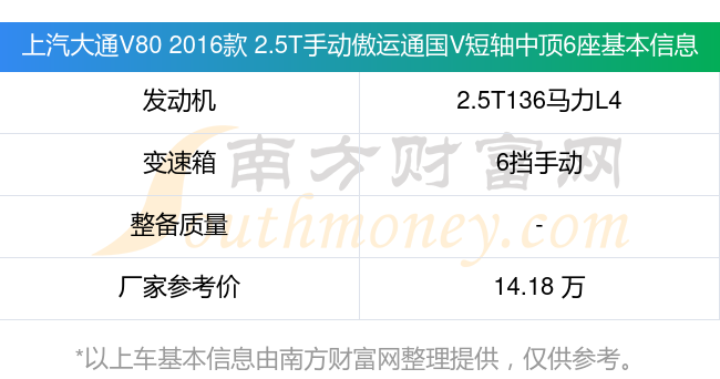 在動力方面,上汽大通V80 2016款 2.5T手動傲運(yùn)通國V短軸中頂6座搭載的是一臺2.5T136馬力L4渦輪增壓發(fā)動機(jī),匹配6擋手動擋變速箱,燃料形式為柴油,廠家參考價(jià)14.18萬元。