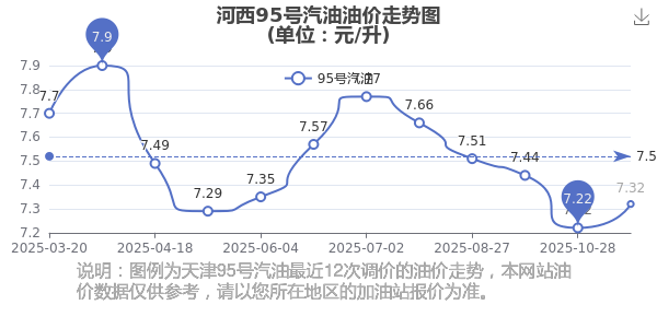 河西95號汽油11月15日的最新價格為7.32元/升,調(diào)整時間為11月11日,相對上次調(diào)整增了0.1元。