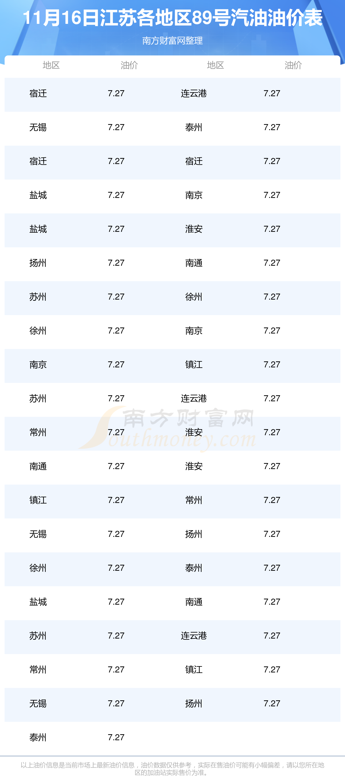 11月16日江蘇89號汽油的油價為11月11日調(diào)整后的價格,具體是6.48元/升,對比上次油價調(diào)整升了0.09元,升1.408%。