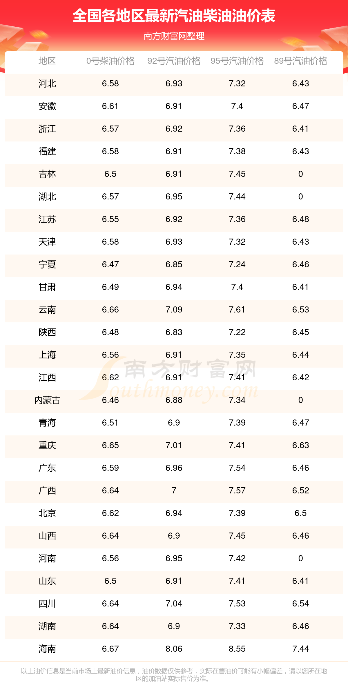 全國0號柴油平均價格為:7元每升,其中,最低為內(nèi)蒙古,價格6.46元/升,最高為海南,價格6.67元/升。