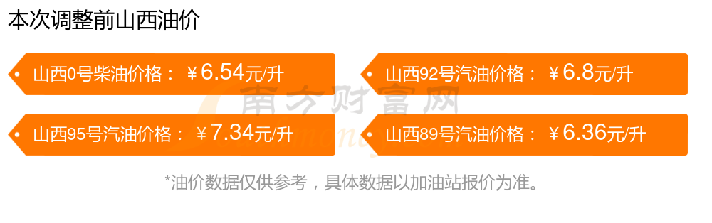 11月16日山西汽油、柴油的價格為11月11日調整后的價格。每升最新價格為:92號汽油6.9元,上升了0.1元;95號汽油7.45元,上升了0.11元;89號汽油6.46元,上升了0.1;0號柴油6.64元,上升了0.1元。