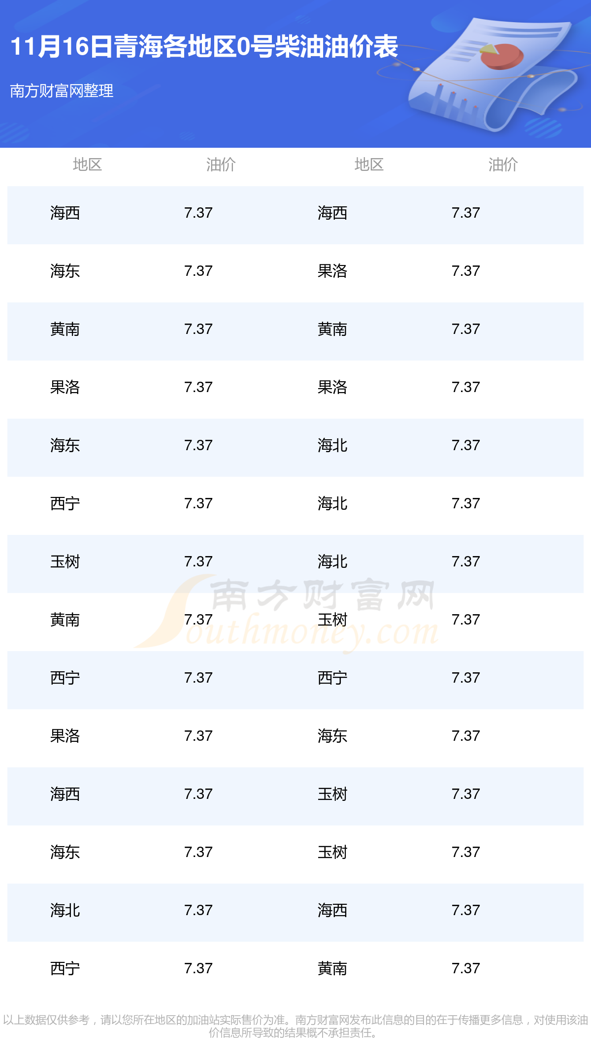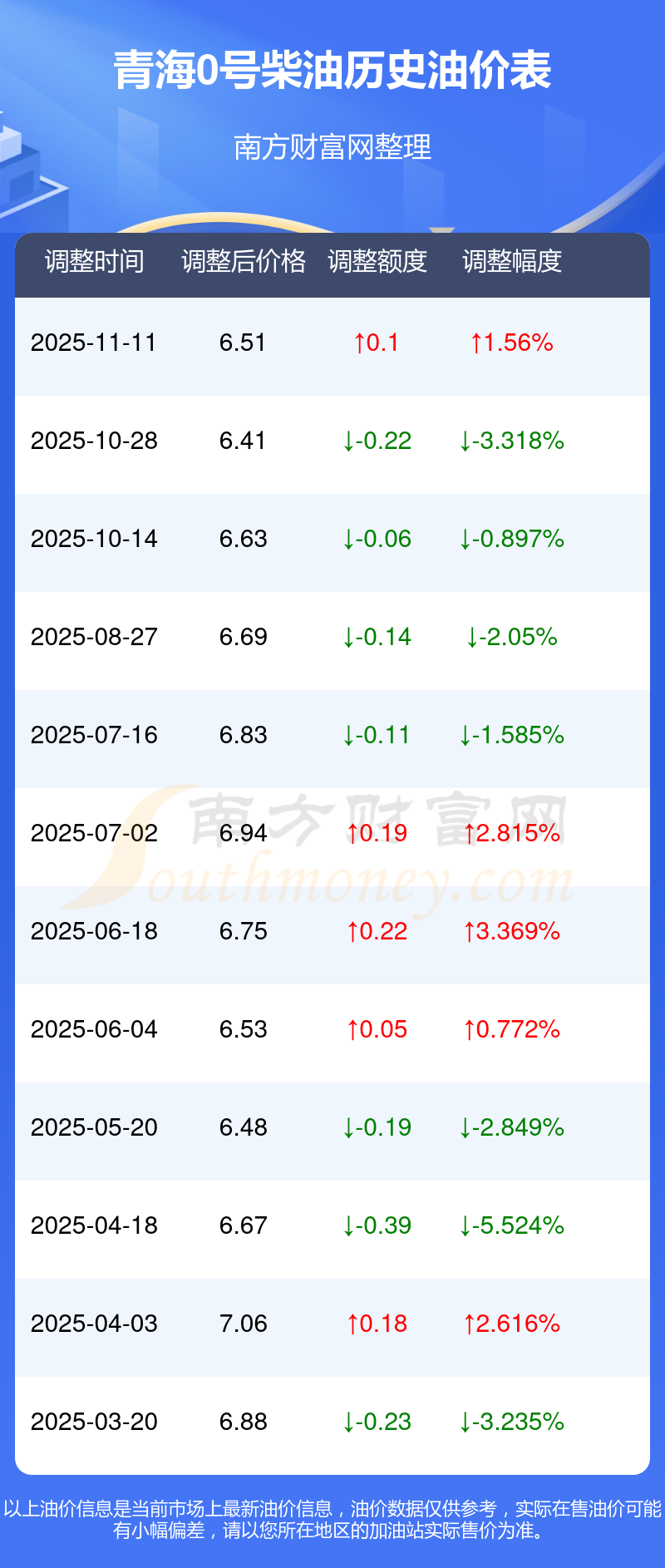 11月16日,青海0號柴油的這些價格為6.51元每升,調(diào)整時間為11月11日,相對上次調(diào)整上升了0.1元,上升1.56%。
