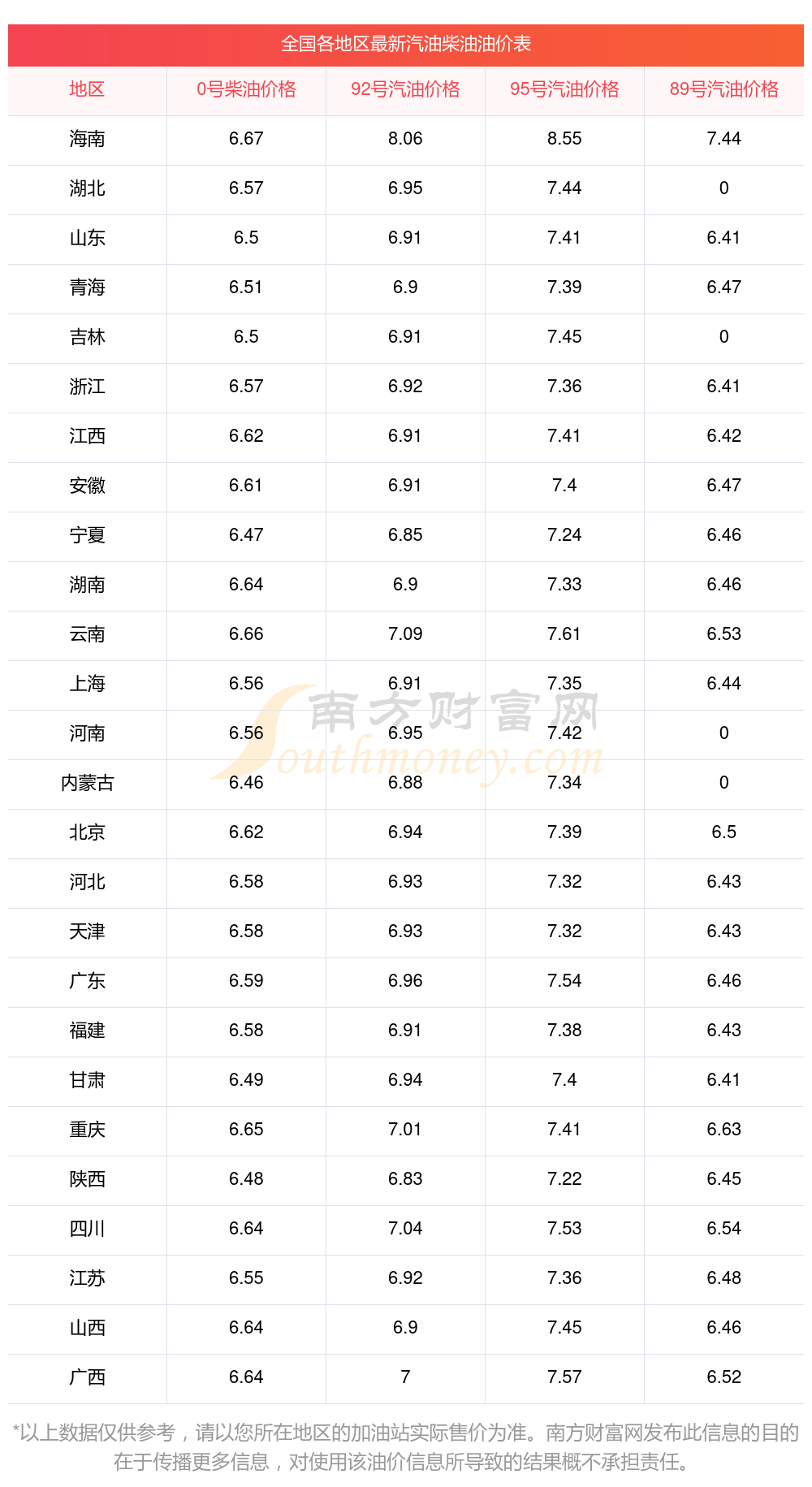 全國(guó)各地區(qū)2025年最新汽油價(jià)格表