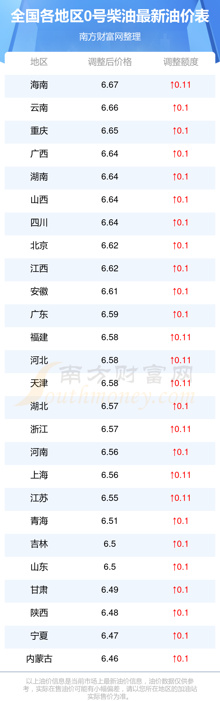 全國0號柴油11月16日最新平均價格為7元/升,調(diào)整時間為11月11日。其中,全國0號柴油最低為內(nèi)蒙古,價格為6.46元/升;0號柴油最高為海南,價格為6.67元/升。