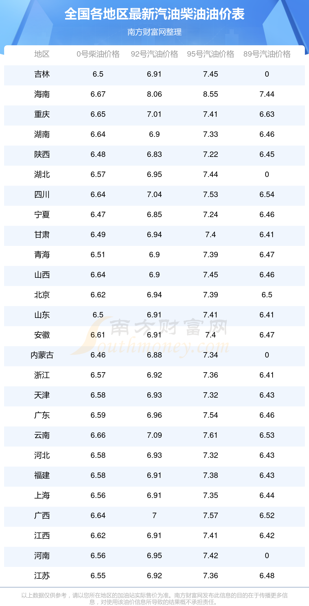 以上數(shù)據(jù)僅供參考,請以您所在地區(qū)的加油站實際售價為準(zhǔn)。南方財富網(wǎng)發(fā)布此信息的目的在于傳播更多信息,對使用該油價信息所導(dǎo)致的結(jié)果概不承擔(dān)責(zé)任。