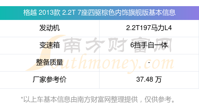 格越 2013款 2.2T 7座四驅(qū)棕色內(nèi)飾旗艦版動(dòng)力上搭載的是一臺(tái)2.2T197馬力L4渦輪增壓發(fā)動(dòng)機(jī),匹配6擋手自一體自動(dòng)檔變速箱,燃料形式為柴油,廠家參考價(jià)37.48萬元。