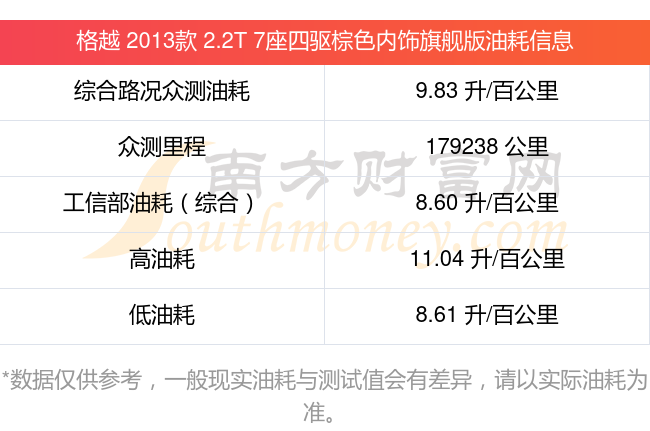 根據(jù)車主實(shí)測(cè)數(shù)據(jù),該車型低油耗為8.61升每百公里,高油耗為11.04升每百公里,綜合路況眾測(cè)油耗為9.83升每百公里,工信部綜合油耗為8.60升每百公里。