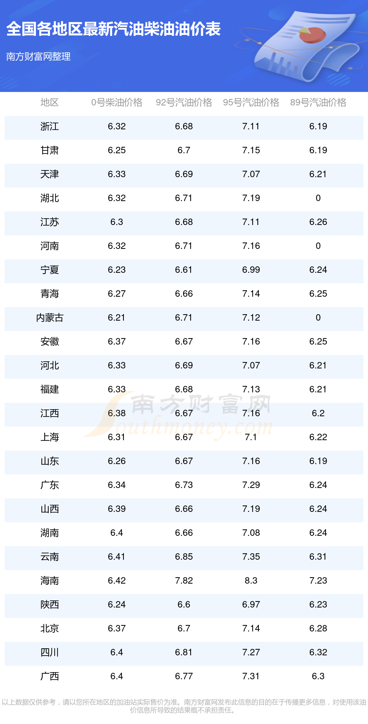 0號柴油平均價(jià)格:6元每升,其中,最高為海南,價(jià)格為6.42元/升,最低為內(nèi)蒙古,價(jià)格為6.21元/升。