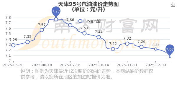12月26日,天津95號(hào)汽油的價(jià)格是7.07元每升,本次的調(diào)整時(shí)間為12月23日,對(duì)比上次的調(diào)整降了0.15元,降2.078%,12月31日24時(shí)為下一輪油價(jià)調(diào)整時(shí)間,還有0天。