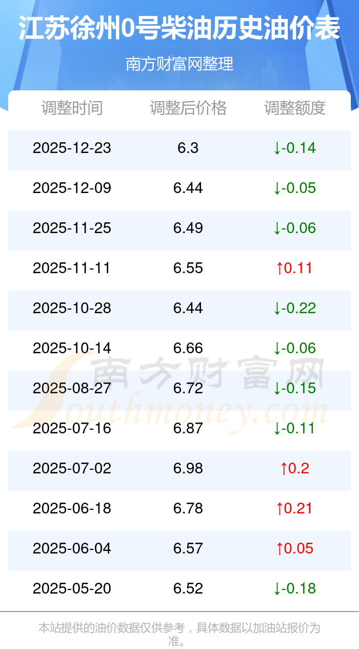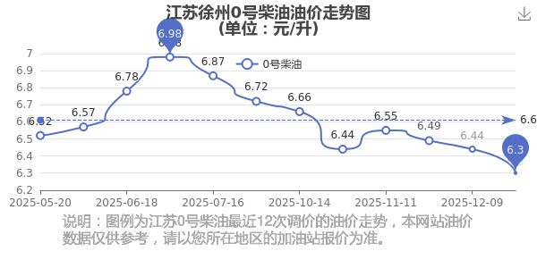 12月26日,江蘇徐州0號(hào)柴油今日價(jià)格(調(diào)整時(shí)間為12月23日):6.3元每升,對(duì)比上次調(diào)整(12月9日)的油價(jià)6.44元每升,共減了0.14元,減幅達(dá)2.174%。