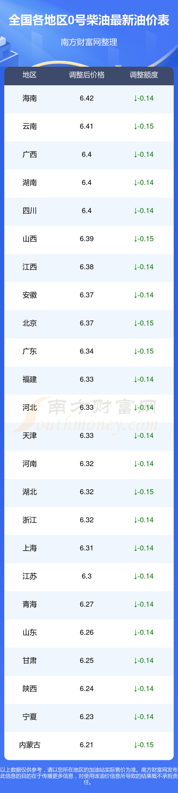 全國各地區(qū)0號(hào)柴油油價(jià)一覽表
