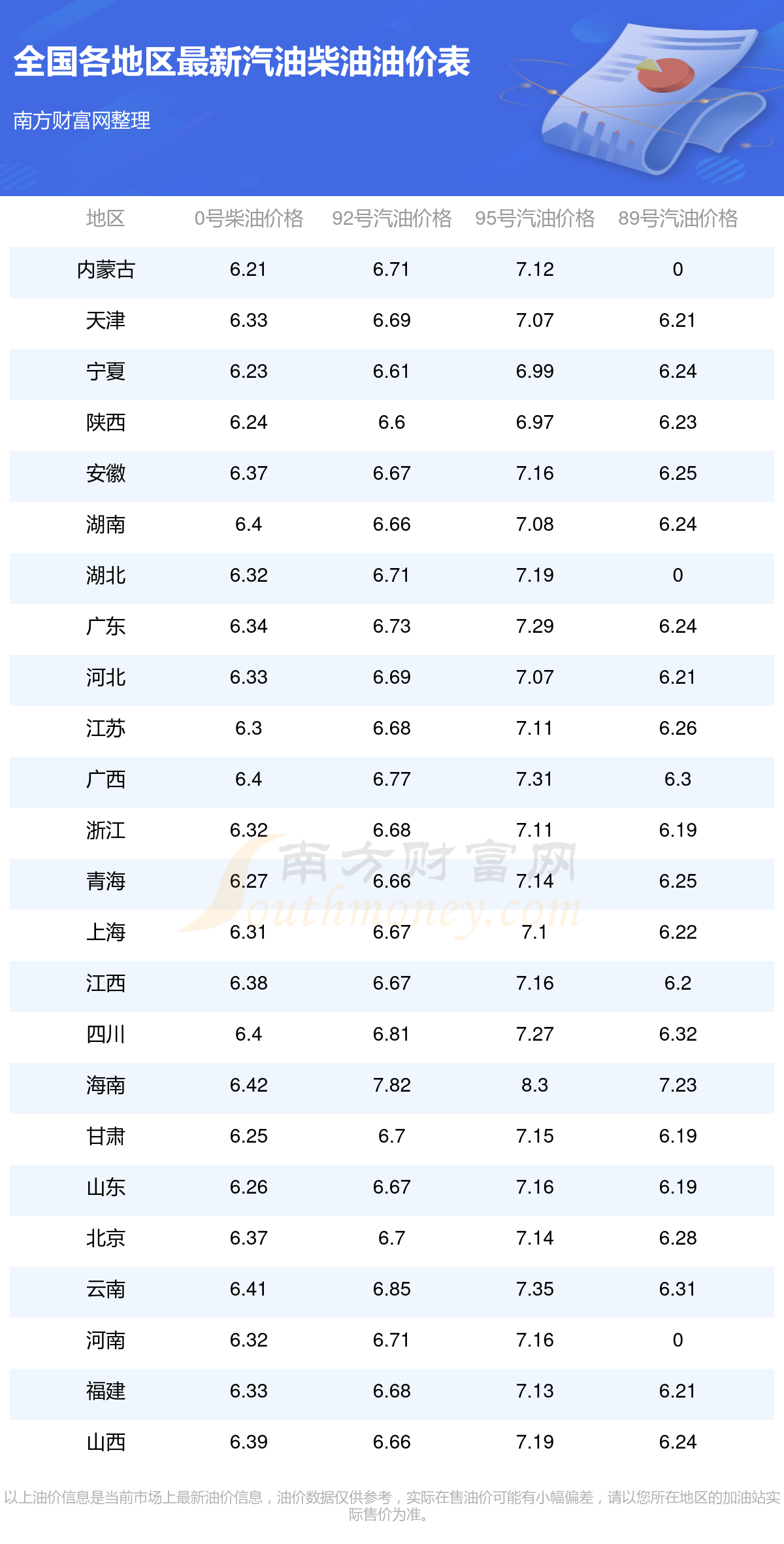 油價最新調整時間為12月23日,全國92號汽油最新平均價格為:7元每升,其中,最低為陜西,價格為6.60元/升,最高為海南,價格為7.82元/升。全國95號汽油最新平均價格為:7元每升,其中,最低為陜西,價格為6.97元/升,最高為海南,價格為8.30元/升。全國0號柴油最新平均價格為:6元每升,其中,最低為內蒙古,價格為6.21元/升,最高為海南,價格為6.42元/升。全國89號汽油最新平均價格為:6元每升,其中,最低為浙江,價格為6.19元/升,最高為海南,價格為7.23元/升。,下一輪油價調整時間12月31日24時,距離現(xiàn)在還有0天。