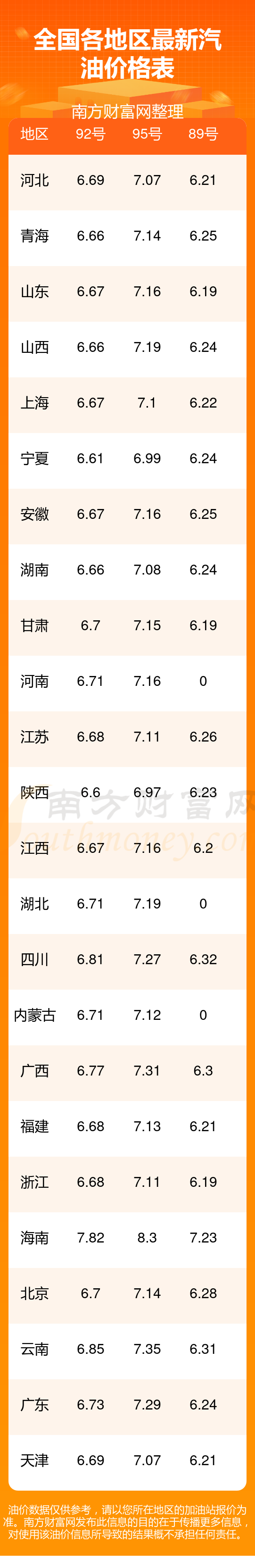 全國95號汽油平均價格為:7元每升,其中,最低為陜西,價格6.97元/升,最高為海南,價格8.30元/升。
