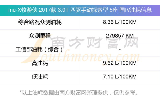 mu-X牧游俠 2017款 3.0T 四驅(qū)手動探索型 5座 國IV動力方面,搭載的是一臺3.0T177馬力L4渦輪增壓發(fā)動機(jī),匹配5擋手動擋變速箱,燃料形式為柴油,常規(guī)整備質(zhì)量2065kg,廠家參考價23.48萬元。