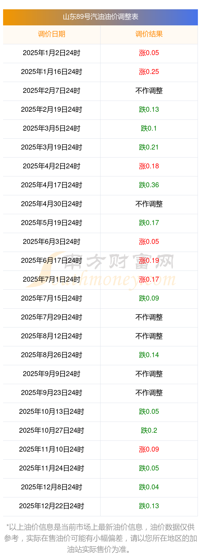 山東89號(hào)汽油油價(jià)調(diào)整表