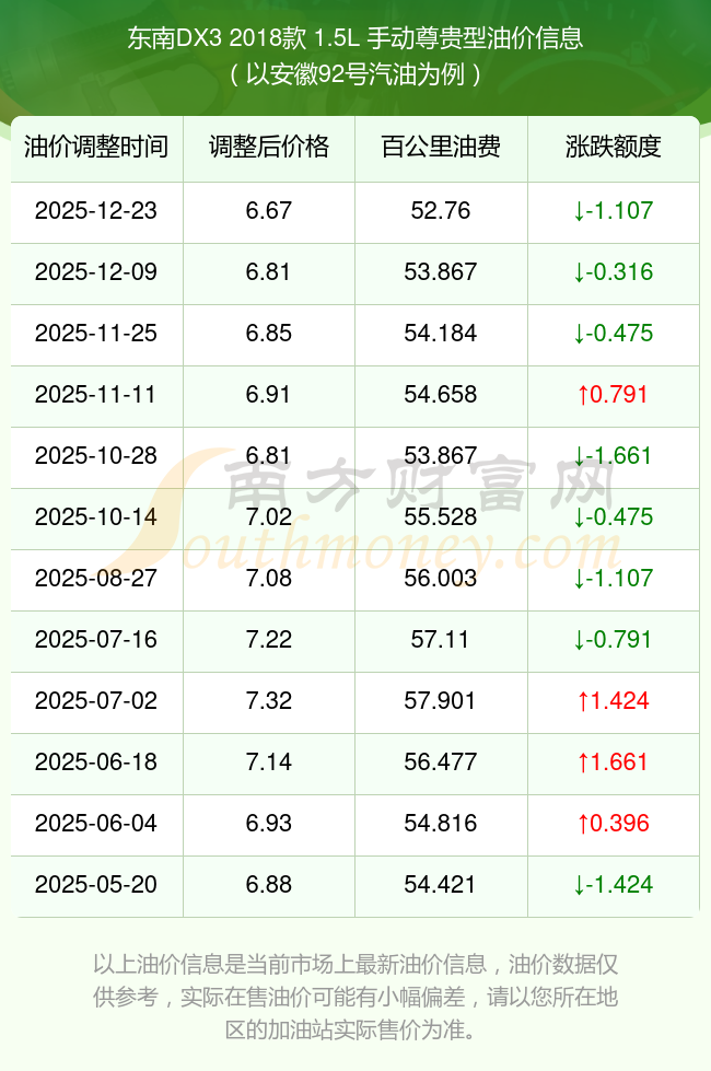 按12月23日92號(hào)汽油最新調(diào)整價(jià)格6.67元每升來計(jì)算(以安徽為例),該車型百公里平均油費(fèi)為52.76元,按上一輪12月9日調(diào)整價(jià)格6.81元每升來計(jì)算,百公里平均油費(fèi)為53.867元,對(duì)比上一輪少花1.107元,下一輪油價(jià)調(diào)整時(shí)間為12月31日24時(shí)。