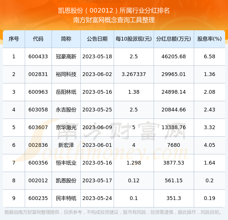 凱恩股份最新一次公布的分紅方案為10派0.12元。本次權(quán)益分派股權(quán)登記日為2023年5月24日,除權(quán)除息日為2023年5月25日,派息日為2023年5月25日。