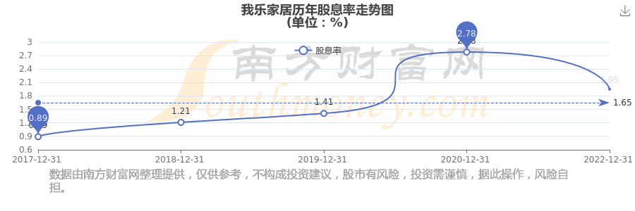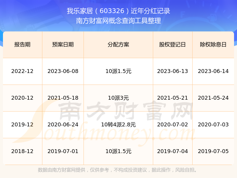 我樂家居最新一次公布的分紅方案為10派1.5元。本次權益分派股權登記日為2023年6月13日,除權除息日為2023年6月14日,派息日為2023年6月14日。
