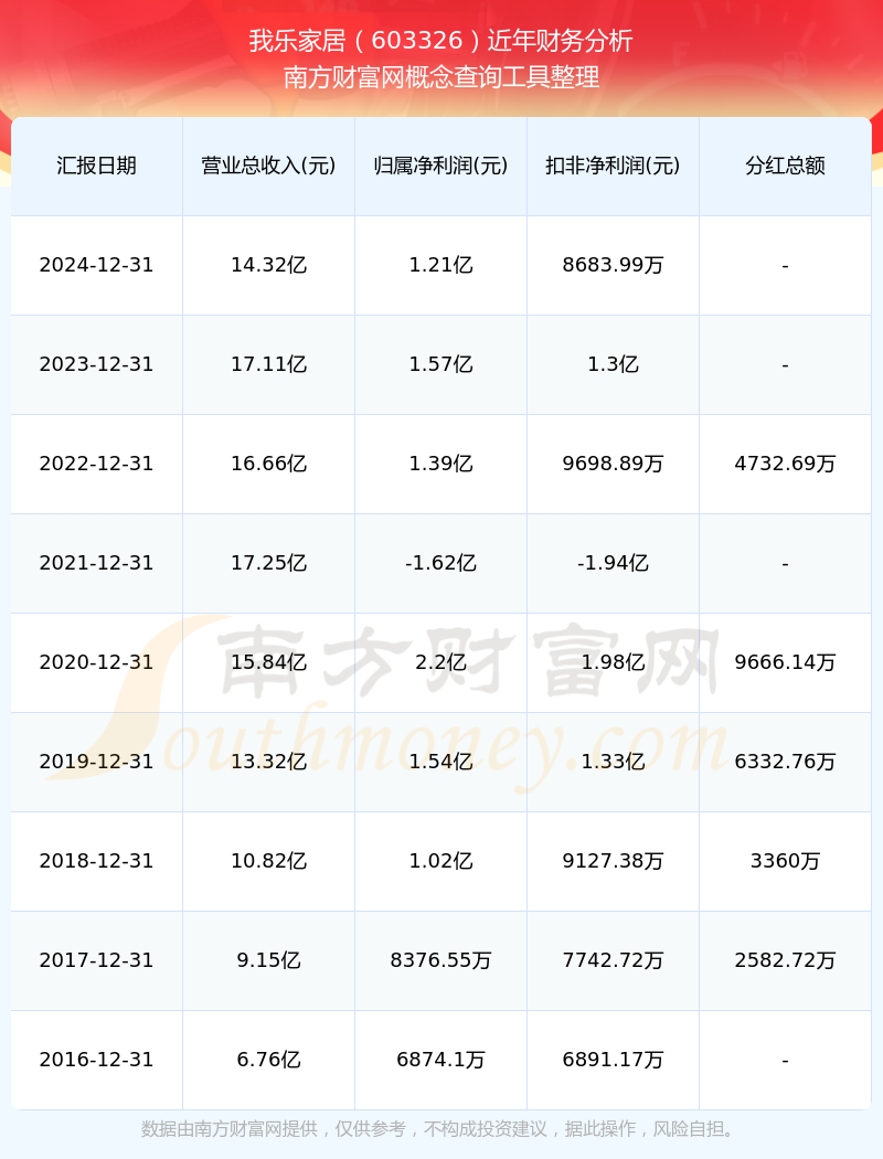 2024年報顯示,我樂家居實現營收14.32億,同比增長-16.29%;凈利潤1.21億,同比增長-22.5%;毛利率46.32%。