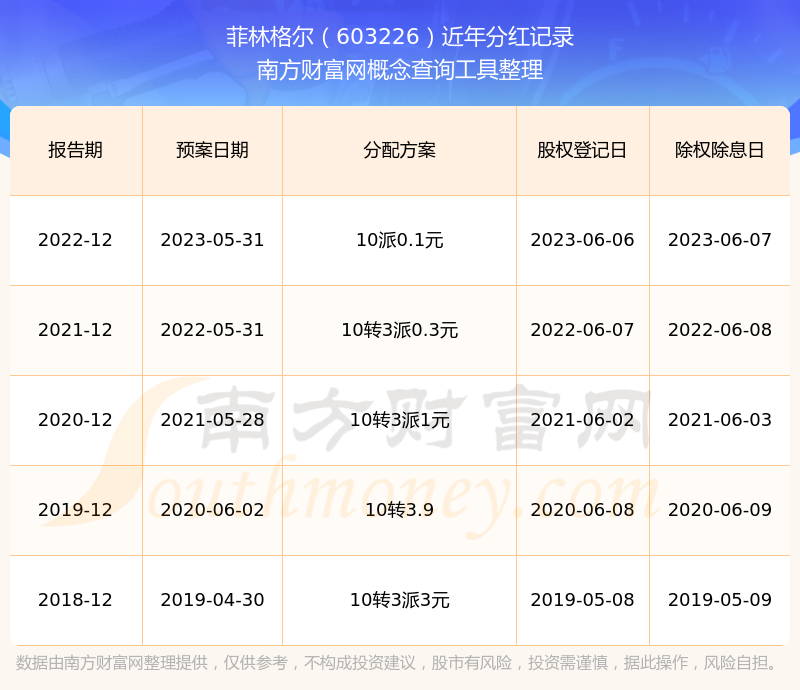 菲林格爾最新一次公布的分紅方案為10派0.1元。本次權(quán)益分派股權(quán)登記日為2023年6月6日,除權(quán)除息日為2023年6月7日,派息日為2023年6月7日。