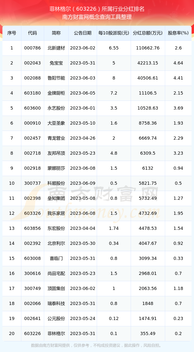 按照南方財富網(wǎng)趨勢選股系統(tǒng)統(tǒng)計,菲林格爾所屬行業(yè)為裝修建材行業(yè),裝修建材行業(yè)分紅排名情況如下表: