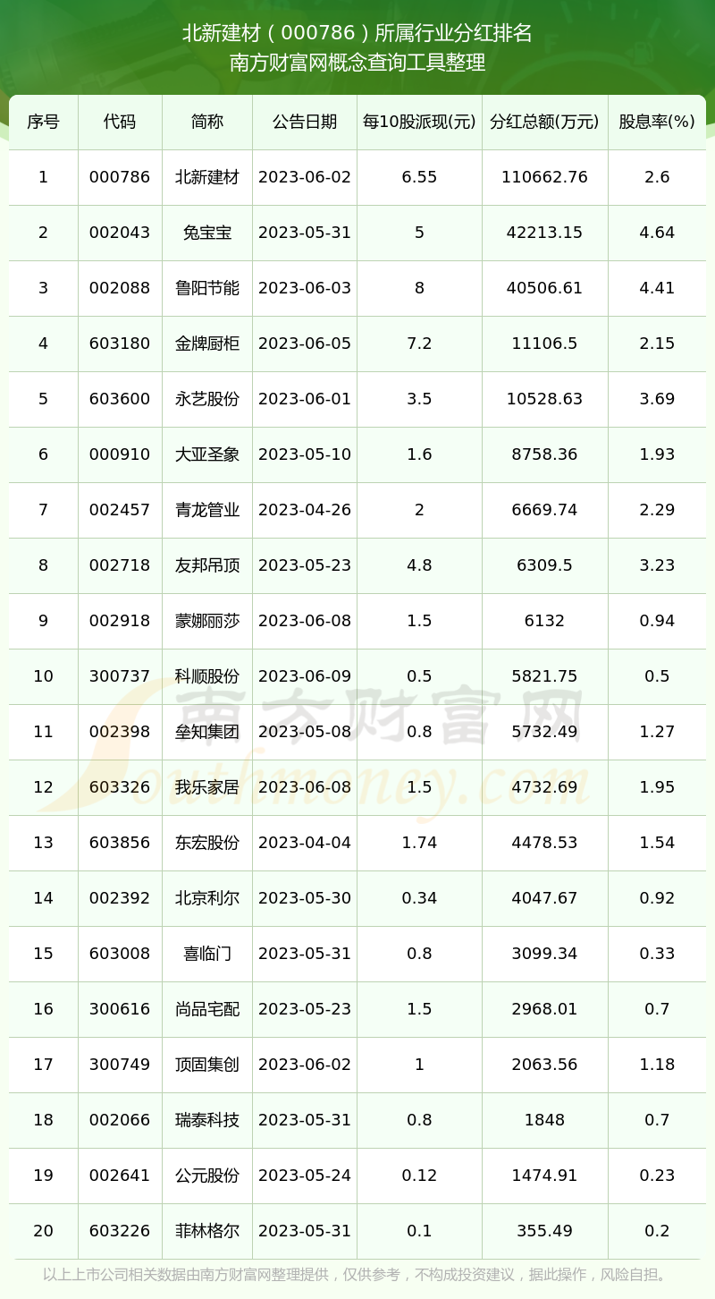 按照南方財富網(wǎng)趨勢選股系統(tǒng)統(tǒng)計,北新建材所屬行業(yè)為石膏板行業(yè),石膏板行業(yè)分紅排名情況如下表: