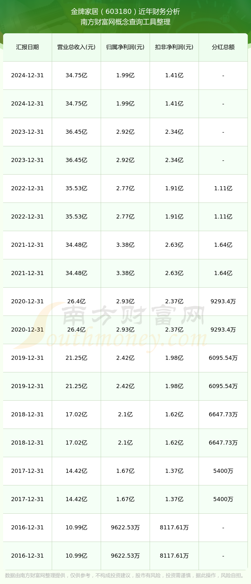 金牌家居最新一次公布的分紅方案為10派7.2元。本次權(quán)益分派股權(quán)登記日為2023年6月8日,除權(quán)除息日為2023年6月9日,派息日為2023年6月9日。